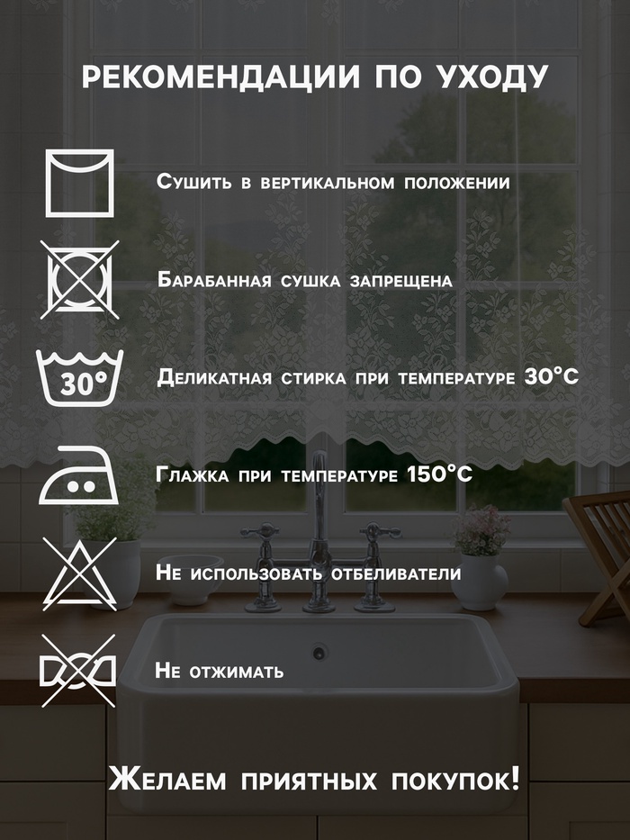 Тонкая ткань требует бережного ухода. Поэтому придерживайтесь лёгких правил и шторы сохранят первозданный внешний вид: