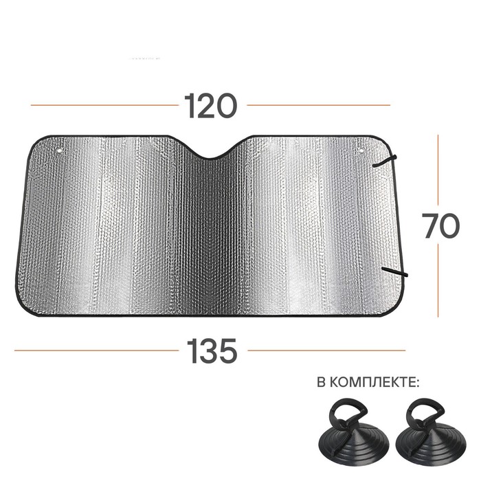 Двусторонняя солнцезащитная шторка размером необходима для блокировки попадания солнечных лучей со стороны лобового стекла в салон машины. Серебристая поверхность шторки отражает солнечные лучи, защищая салон и торпеду автомобиля от нагрева. Крепится к лобовому стеклу с помощью двух присосок. Высота шторки 70 см - идеальна для средне размерных автомобилей.