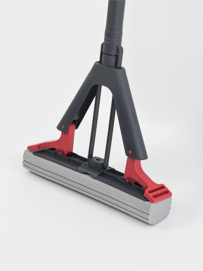 Швабра со складной насадкой из поролона ПВА и стальным двухсекционным черенком. Её главная особенность — встроенный механизм отжима, который помогает контролировать количество воды на полу без наклонов и контакта рук с влажной губкой.