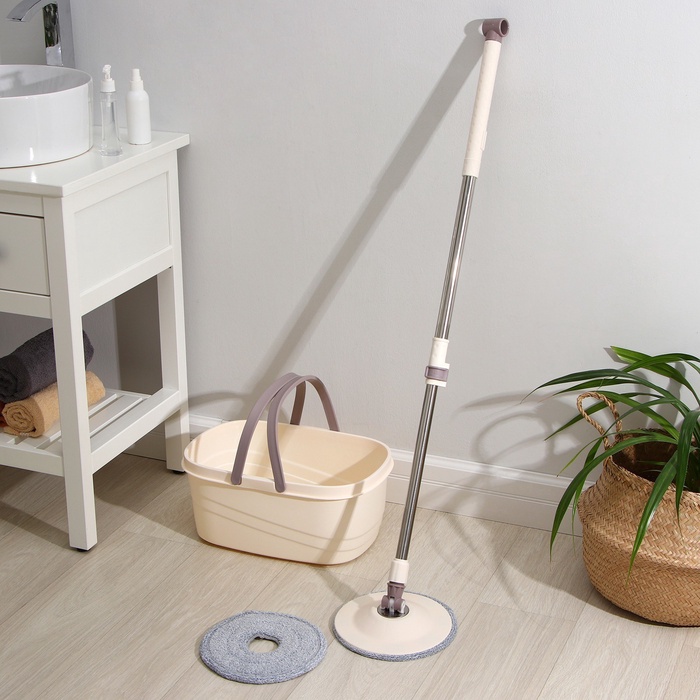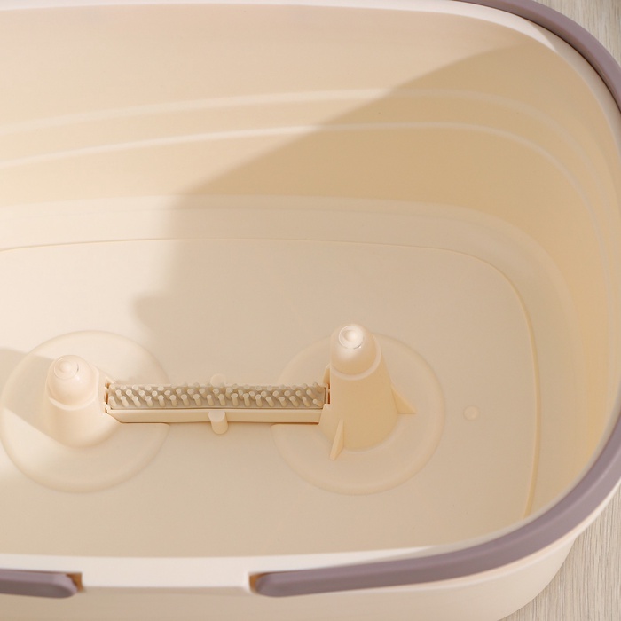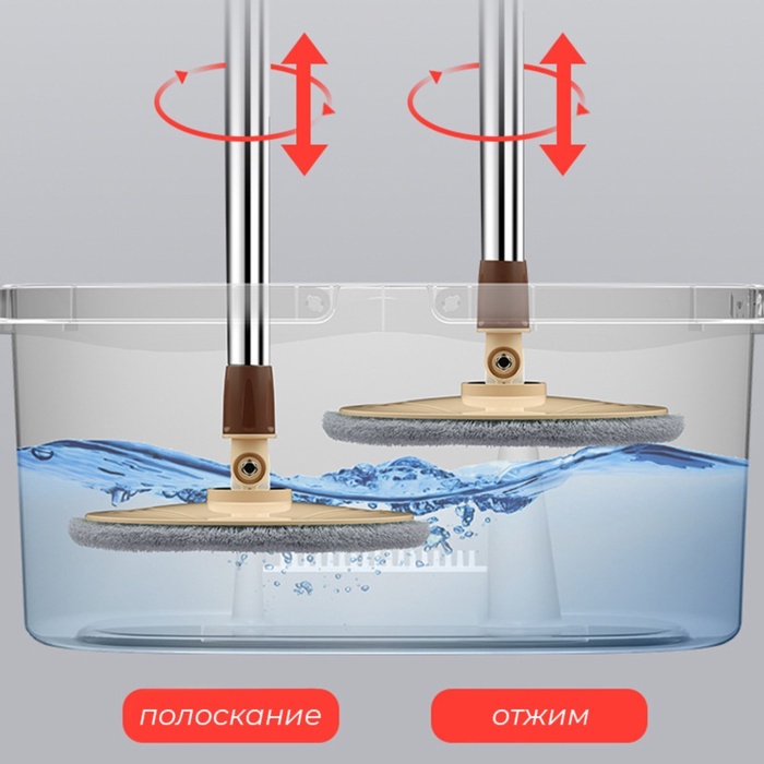 - Ведро оснащено конусами для отжима и полоскания. Резиновая щётка позволяет без особых усилий очистить насадку при полоскании, а инновационная система отжима эффективно удалит лишнюю влагу с насадки из микрофибры.