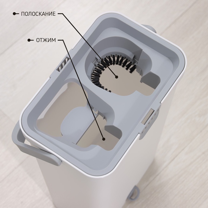 - Ведро с двумя отсеками. Отсек для полоскания с щёточками, который при минимальных усилиях позволяет быстро и эффективно очистить насадку. Второй отсек с роликом для вертикального отжима.