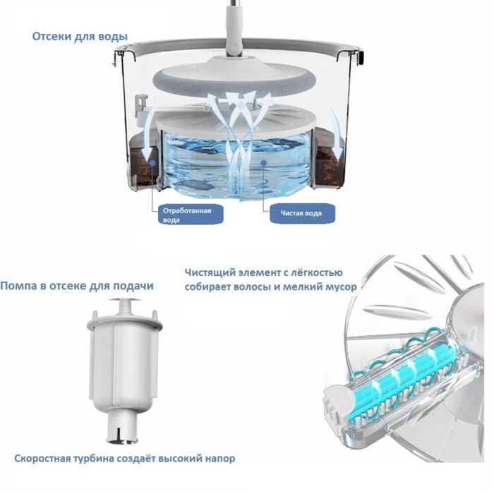 Ведро оснащено механизмом подачи воды, благодаря чему грязная и чистая вода находятся в разных отсеках. Это позволяет полоскать швабру только чистой водой. А щеточка очистит насадку от мусора.