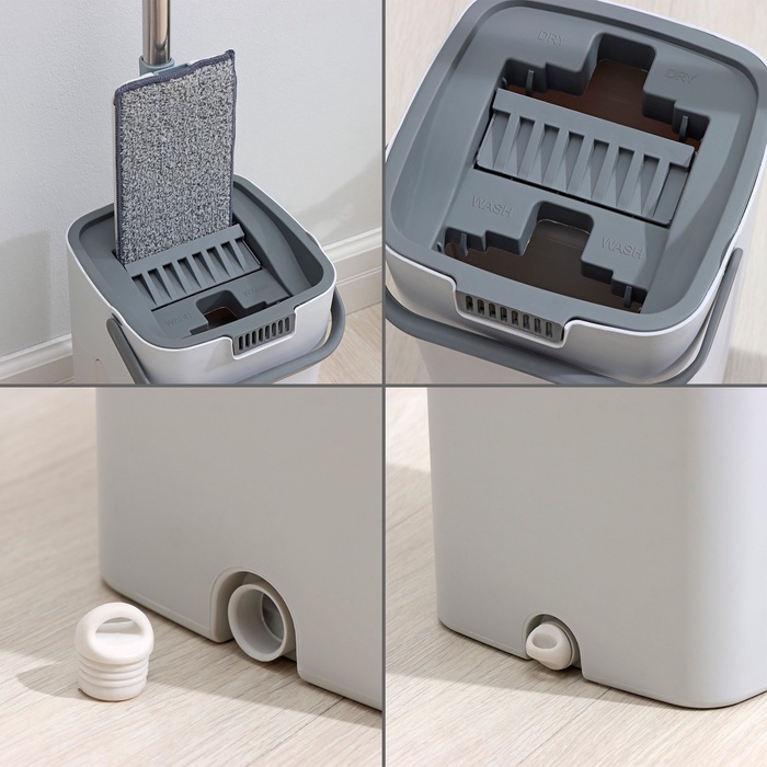 Этот набор включает ведро с двумя отсеками, плоскую швабру и две насадки из микрофибры. Ведро оснащено специальным отсеком для полоскания и отжима, что позволяет эффективно удалять загрязнения с насадок, а также сливным отверстием для быстрого удаления использованной воды.