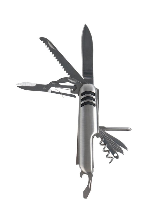 - 11 функций – нож, ножницы, две пилы (одинарная и двойная), крестовая отвёртка, открывалка, консервный нож, штопор, шило, напильник, нитевдеватель.