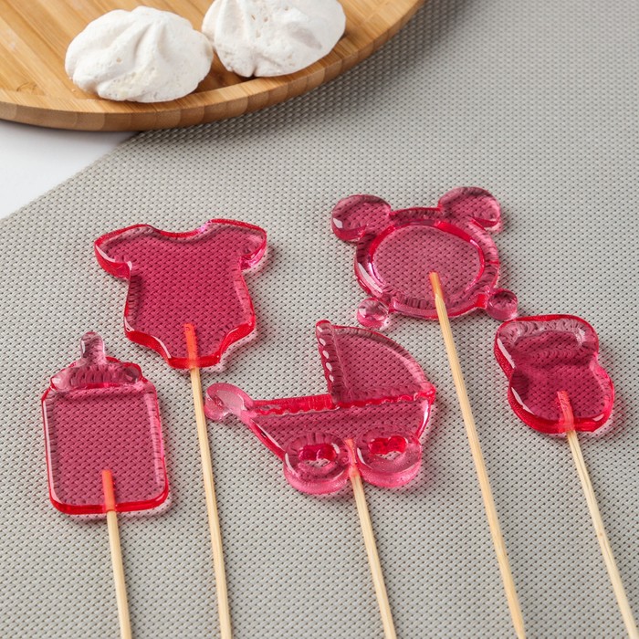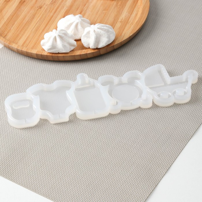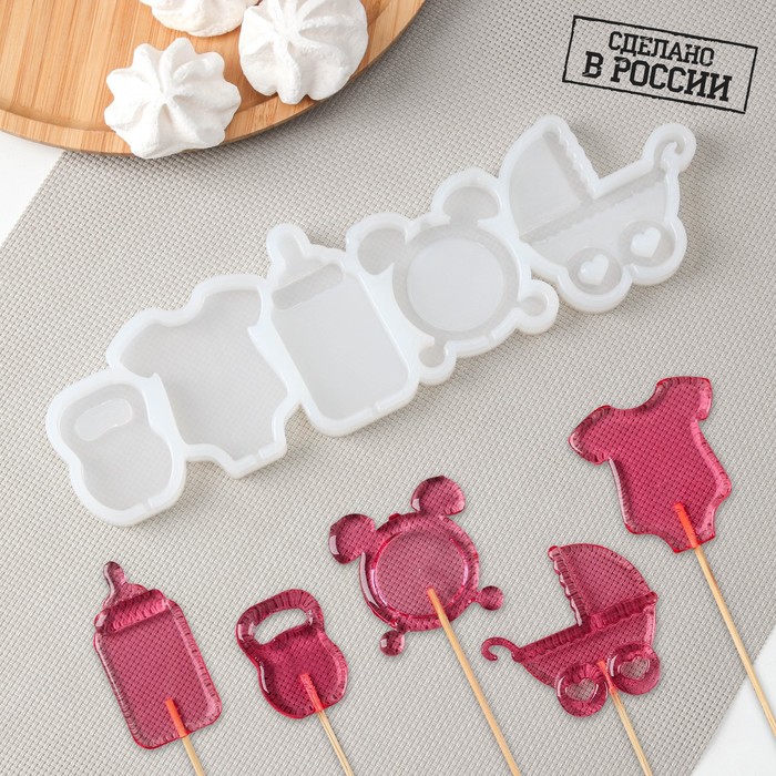 Силиконовый молд для леденцов и шоколада «Детский набор», коляска 7×6,7 см, боди 6×5,5 см, гиря 4,5×3,2 см, бутыль 7×3,5 см, прозрачный