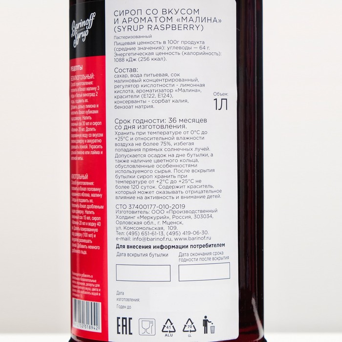 Состав: сахар, сок малиновый концентрированный, регулятор кислотности – лимонная кислота, ароматизатор «Малина», красители – Е122, Е124, консерванты – сорбат калия, бензоат натрия.