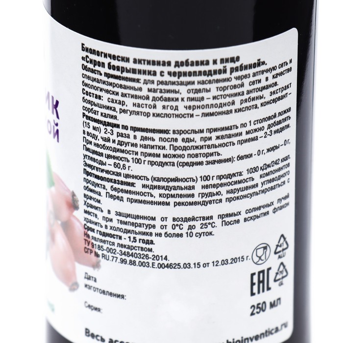 Состав: сахар, настой ягод черноплодной рябины, экстракт боярышника, регулятор кислотности - лимонная кислота, консервант - сорбат калия.