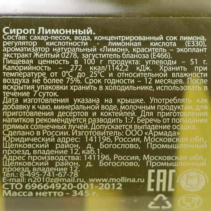 Состав: сахар-песок, вода, концентрированный сок лимона, регулятор кислотности - лимонная кислота(Е330), ароматизатор натуральный «Лимон», краситель – экоплант экстракт Жёлтый 0278, загуститель бланоза (Е466). Пищевая ценность в 100 г продукта: углеводы – 51 г. Калорийность – 272 ккал/1142,2 кДж.
