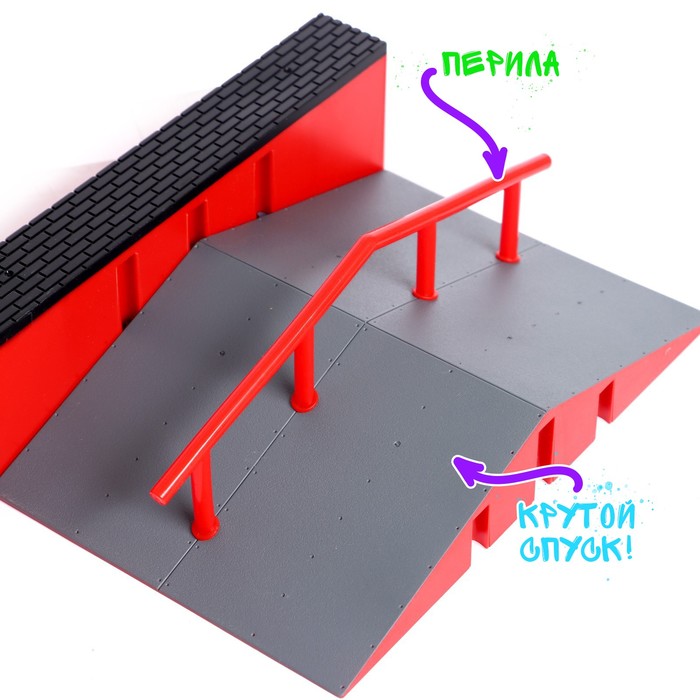 - Набор включает в себя комплекс с трамплином и перилами, которые расширяют границы возможностей для трюков и маневров.