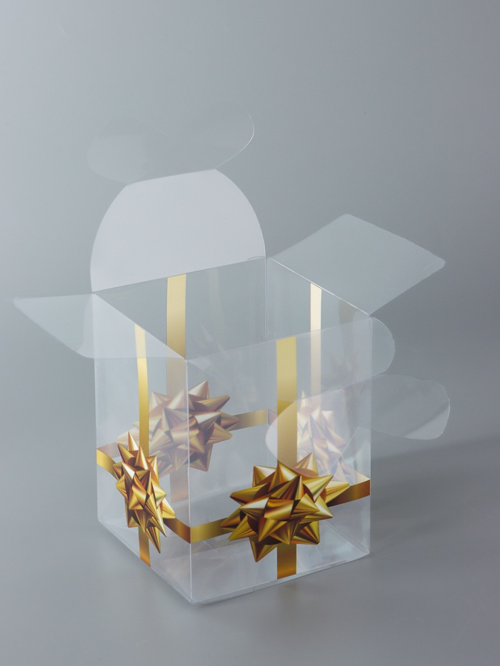 - Готовое праздничное оформление: Золотой бантик на прозрачной поверхности служит самостоятельным украшением. Это решение избавляет от необходимости дополнительного декорирования упаковки.
