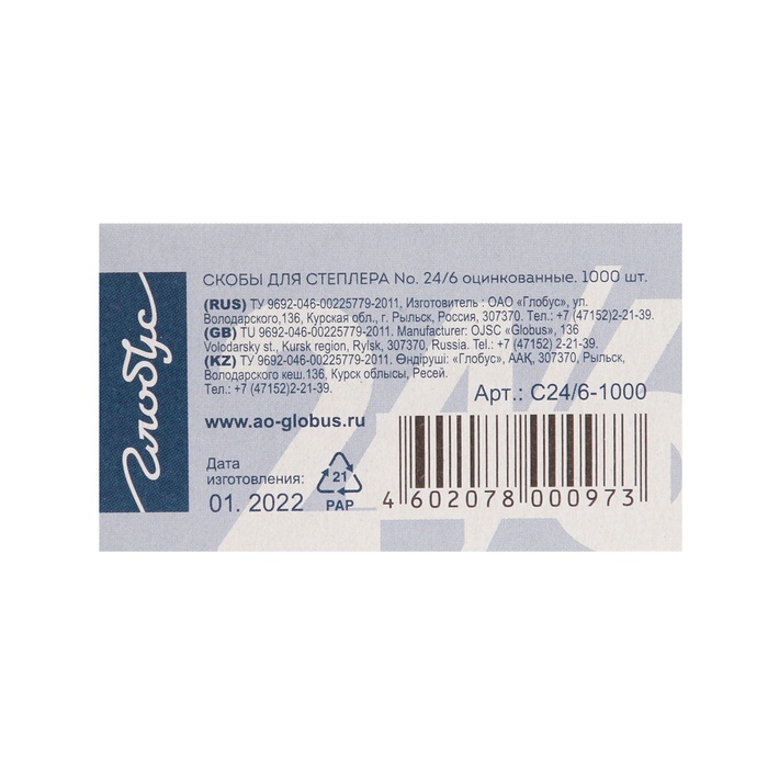 Скобы металлические №24/6, GLOBUS, для степлера, 1000 шт., высококачественная сталь