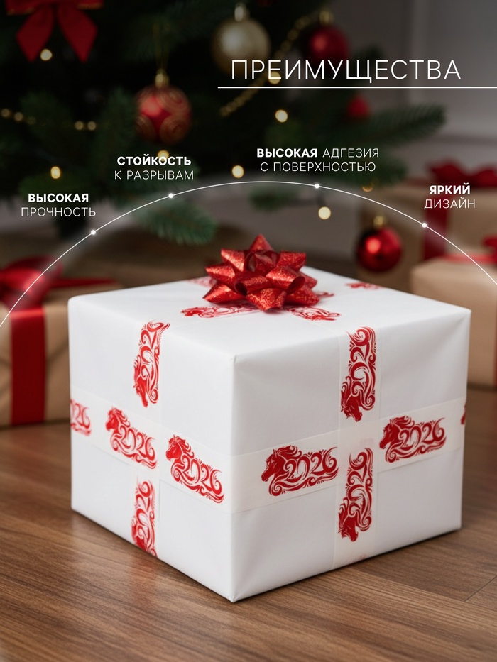 Создайте праздничное настроение и подчеркните уникальность подарков с помощью этого яркого скотча. Каждый рулон украшен праздничным логотипом «Лошадь 2026», который сразу привлекает внимание и делает упаковку стильной и праздничной.