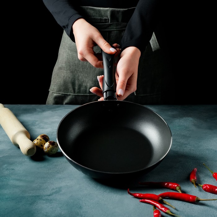 Сковорода изготовлена из высококачественного материала, обеспечивающего равномерное распределение тепла по всей поверхности. Антипригарное покрытие предотвращает прилипание продуктов и облегчает процесс мытья. Удобная пластиковая ручка не нагревается во время готовки, что обеспечивает безопасность использования.