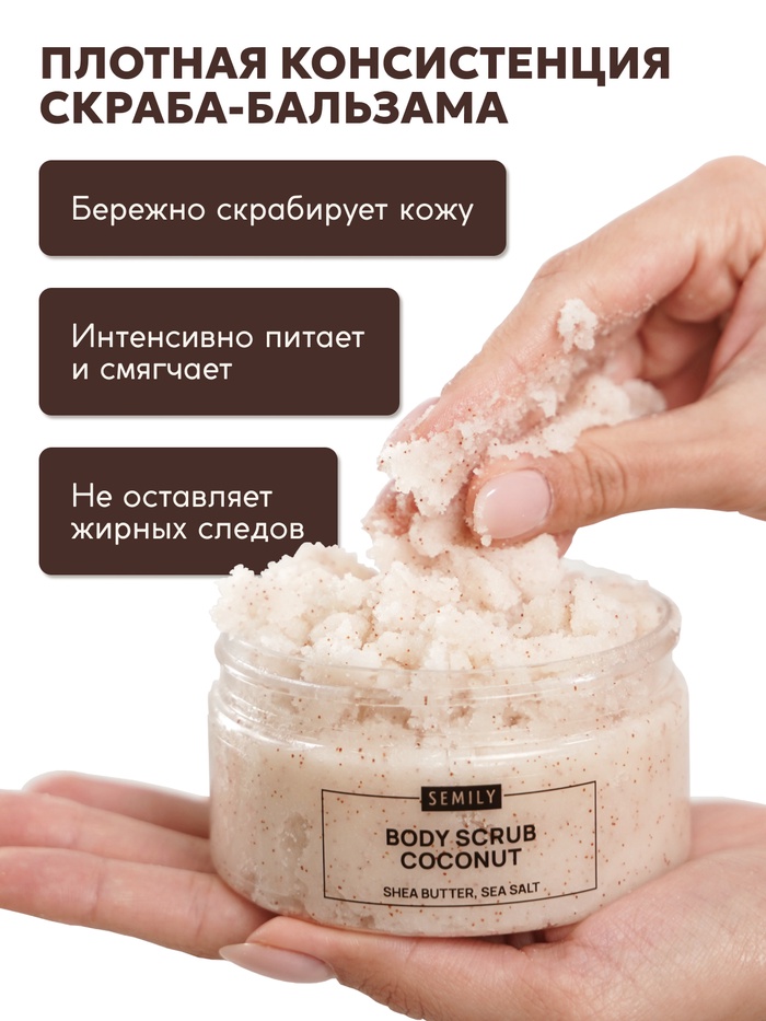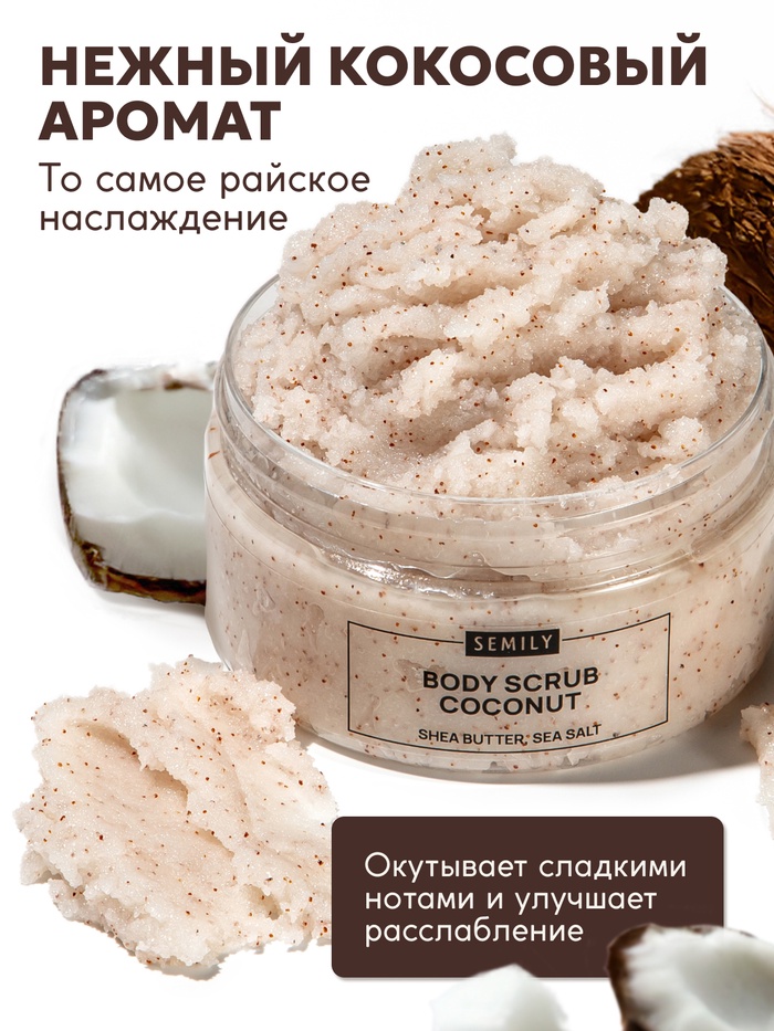 Кокосовая стружка и морская соль эффективно обновляют кожу, а масла кокоса и сладкого миндаля интенсивно увлажняют и делают кожу мягкой. Экстракты алоэ вера и розы успокаивают и восстанавливают кожу, придавая ей естественное сияние.