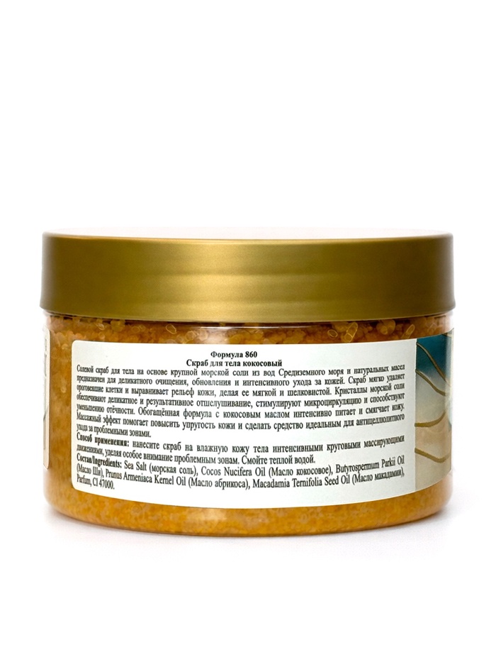 Sea Salt (морская соль), Cocos Nucifera Oil (Масло кокосовое), Butyrospermum Parkii Oil (Масло Ши), Prunus Armeniaca Kernel Oil (Масло абрикоса), Macadamia Ternifolia Seed Oil (Масло макадамии), Parfum, CI 47000.