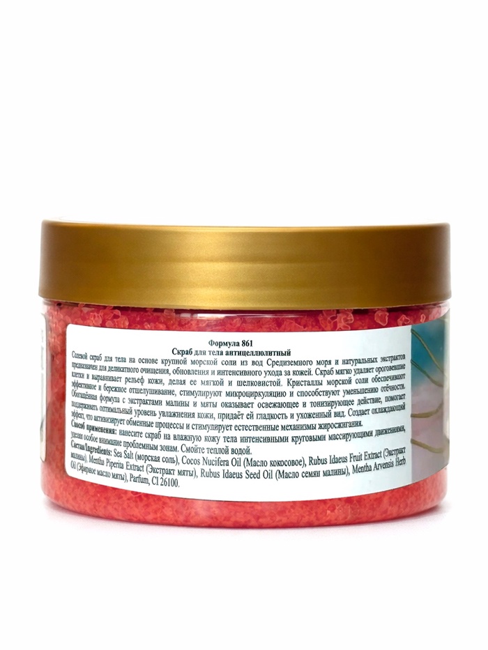- Солевой скраб для тела на основе крупной морской соли из вод Средиземного моря и натуральных экстрактов предназначен для деликатного очищения, обновления и интенсивного ухода за кожей.