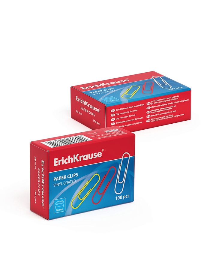 Скрепки канцелярские 28 мм, 100 шт, ErichKrause, цветные с виниловым покрытием, картонная упаковка, микс