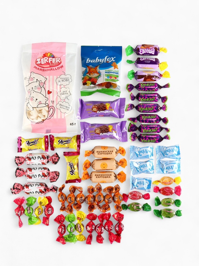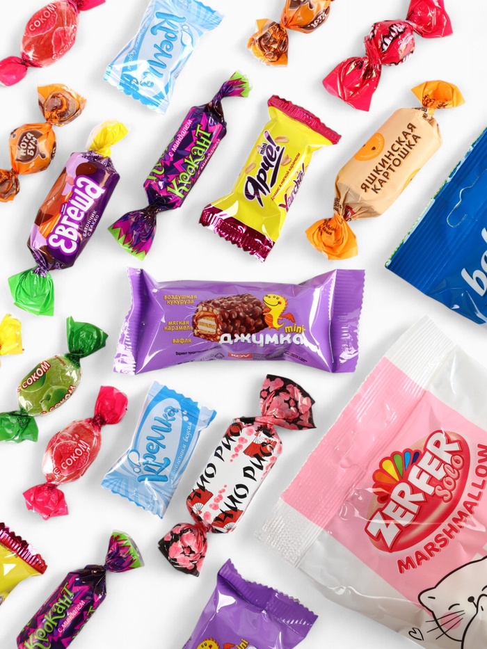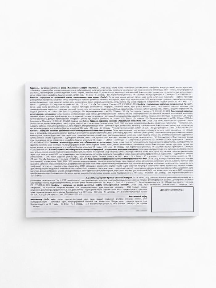 Состав: сахар, патока, масла растительные (антиокислитель: токоферолы, концентрат смеси), крахмал кукурузный, стабилизатор – гуммиарабик, влагоудерживающие агенты: сорбитовый сироп, лактат натрия; регуляторы кислотности: кислота молочная, лимонная кислота; желирующий агент – пектины, концентрированные соки яблока, чёрной моркови, красители: куркумин, экстракт паприки, синий блестящий FCF; ароматизаторы, эмульгатор – лецитин соевый. Может содержать диоксид серы, следы глютена, яиц, молока, арахиса, орехов и продуктов их переработки.
