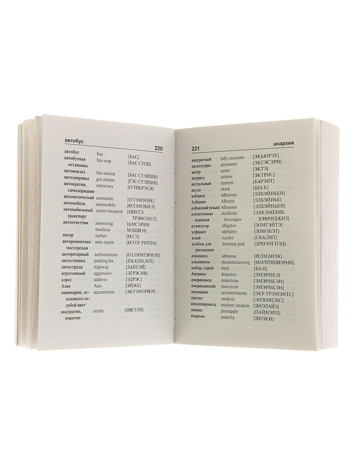 - Транскрипция русскими буквами в обеих частях словаря помогает правильно произносить слова без знания международной фонетической системы.