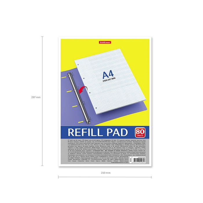 Сменный блок для тетрадей на кольцах формата А4 (210х297 мм). Благодаря плотной верхней обложке блок не деформируется. 80 листов в клетку. Бумага офсетная плотностью 60 г/м2. Цвет линовки - синий. Перфорация под кольца. Имеет индивидуальную упаковку в термоусадочную пленку
