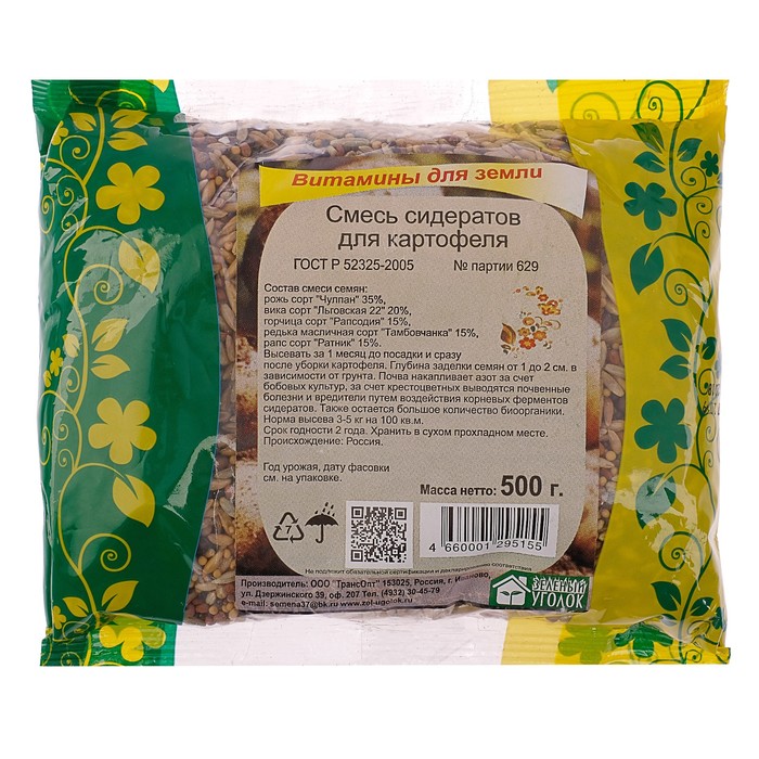 Норма высева — 0,2 - 0,5 кг на 1 сотку. Состав: рожь 35%, вика 20%, горчица 15%, редька 15%, рапс 15%.