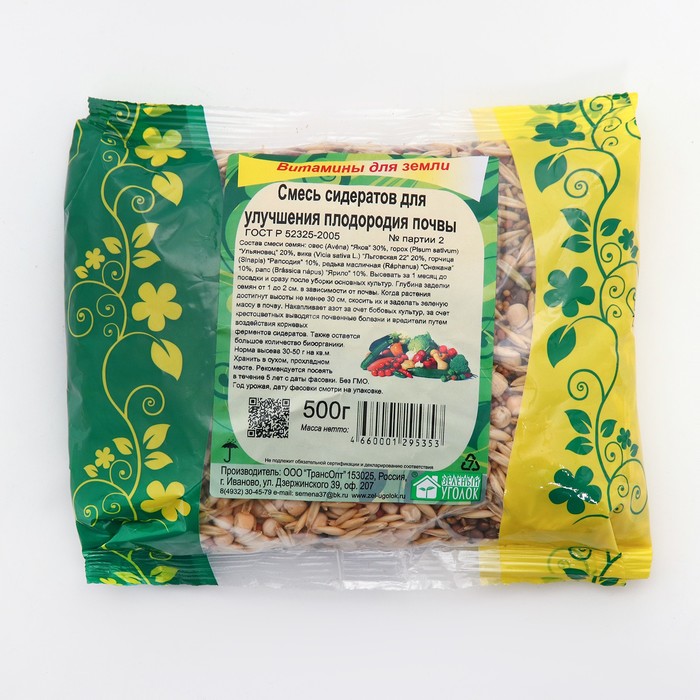 Состав: овес 30%, горох 20%, вика 20%, горчица 10%, редька масличная 10%, рапс 10%