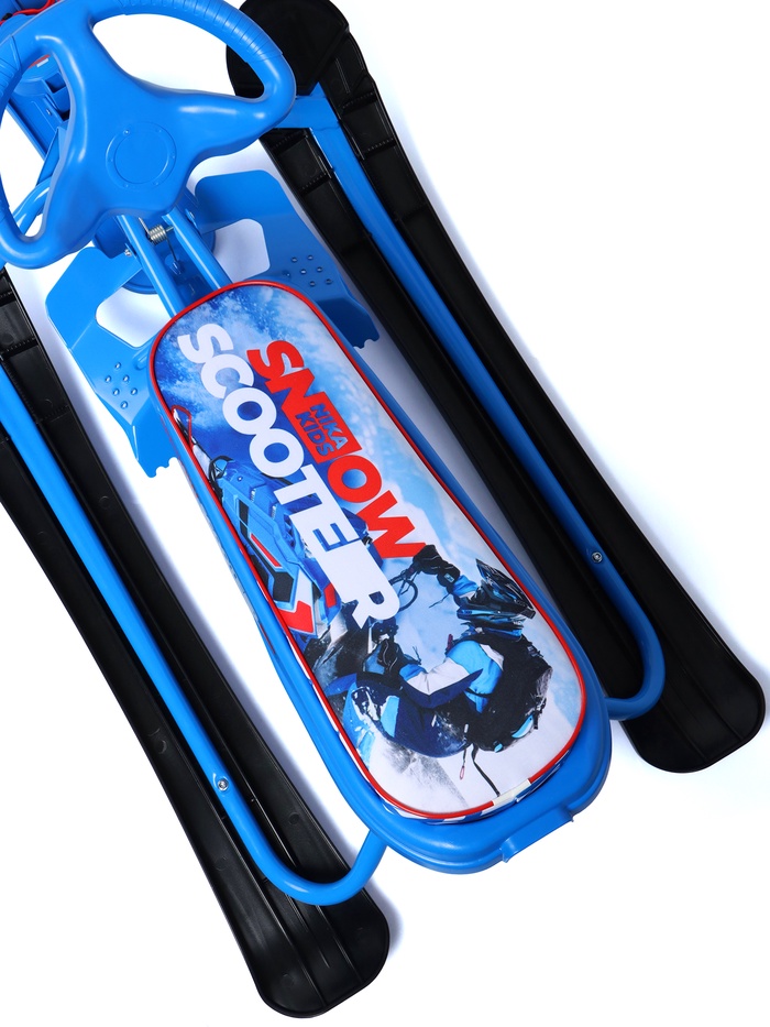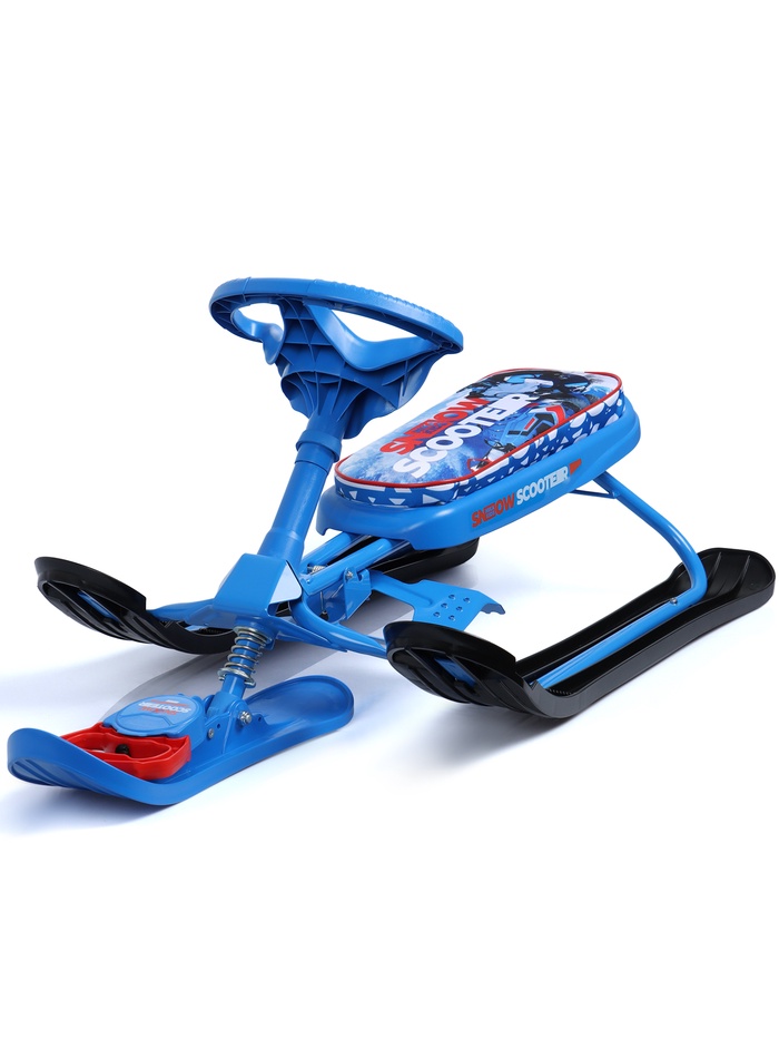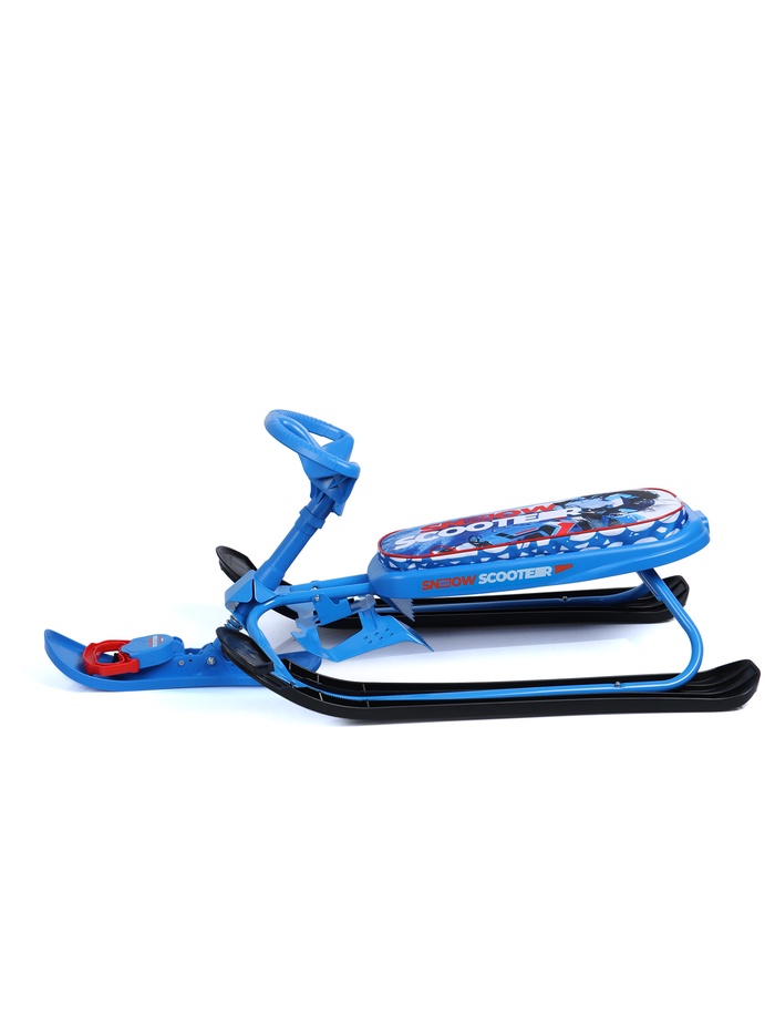 Снегокат предназначен для перевозки детей по плотному снегу или льду, катанию с горок. Имеет сварную конструкцию из стальных труб, пластиковых элементов и мягкое сиденье, обтянутое искусственной кожей с рисунком. Оснащён буксировочным тросом с автоматической намоткой и системой амортизации, которая обеспечивает комфортную поездку по крутым горкам и неровным поверхностям. Усиленный тормоз эффективен на обледенелой поверхности.