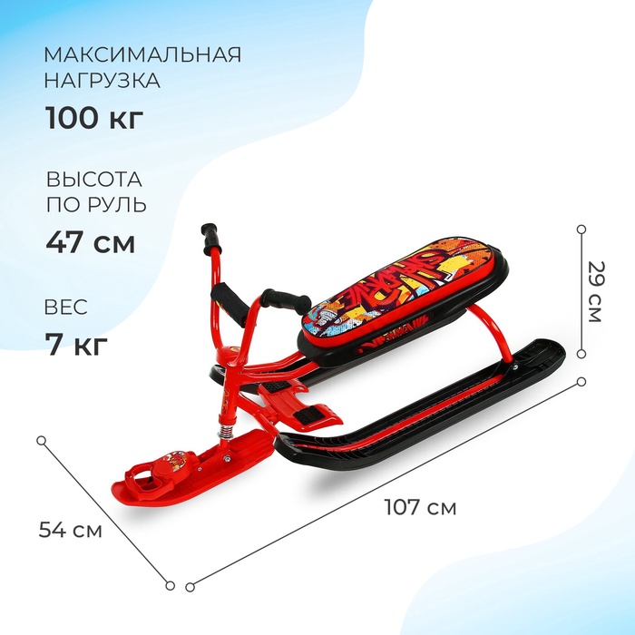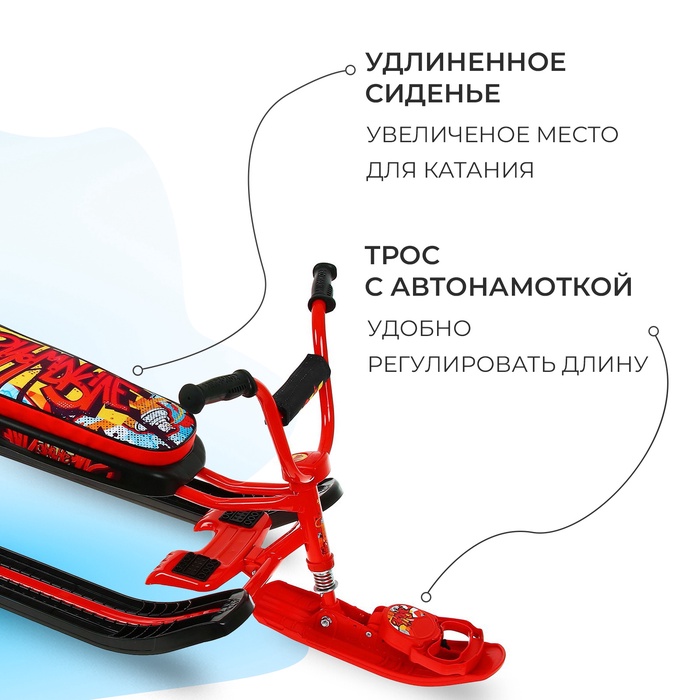 Снегокат предназначен для перевозки детей по плотному снегу или льду, катанию с горок. Имеет сварную конструкцию из стальных труб и пластиковых элементов. Оснащён мягким сиденьем, обтянутым искусственной кожей с рисунком. Оборудован буксировочным тросом с автоматической намоткой и системой амортизации, которая обеспечивает комфортную поездку по крутым горкам и неровным поверхностям. Усиленный тормоз эффективен на обледенелой поверхности.