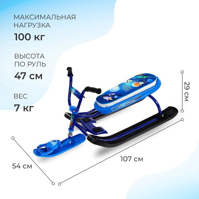 Снегокат предназначен для перевозки детей по плотному снегу или льду, катанию с горок. Имеет сварную конструкцию из стальных труб и пластиковых элементов. Оснащён мягким сиденьем, обтянутым искусственной кожей с рисунком. Оборудован буксировочным тросом с автоматической намоткой и системой амортизации, которая обеспечивает комфортную поездку по крутым горкам и неровным поверхностям. Усиленный тормоз эффективен на обледенелой поверхности.