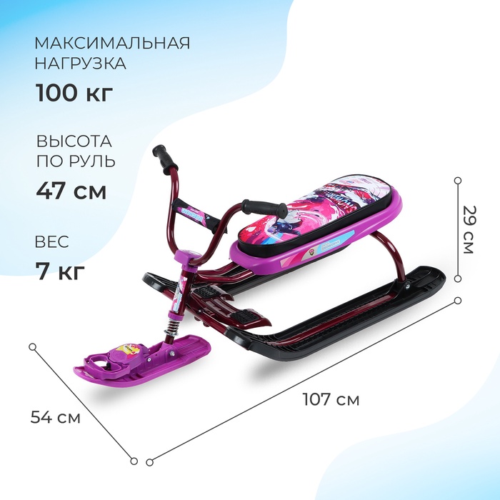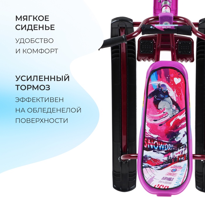 Снегокат предназначен для перевозки детей по плотному снегу или льду, катанию с горок. Имеет сварную конструкцию из стальных труб и пластиковых элементов. Оснащён мягким сиденьем, обтянутым искусственной кожей с рисунком. Оборудован буксировочным тросом с автоматической намоткой и системой амортизации, которая обеспечивает комфортную поездку по крутым горкам и неровным поверхностям. Усиленный тормоз эффективен на обледенелой поверхности.