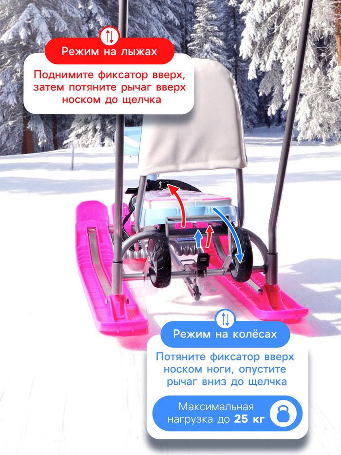 Снегокат предназначен для перевозки детей от 4 до 7 лет по плотному снегу или льду. Имеет сварную конструкцию из стальных труб, пластиковых элементов и мягкое сиденье, обтянутое искусственной кожей с рисунком. Оснащён буксировочным тросом с автоматической намоткой, механизмом выдвижных шасси, родительской ручкой и складной спинкой. Усиленный тормоз эффективен на обледенелой поверхности.