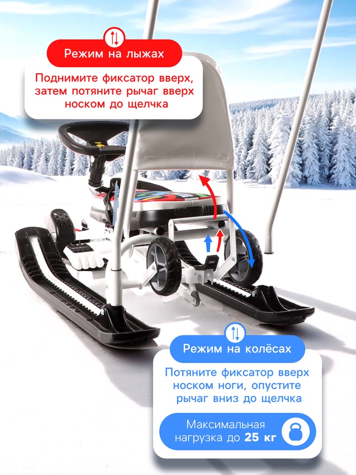 Снегокат предназначен для перевозки детей по плотному снегу, льду или более твёрдой поверхности, а также для катания с горок. Имеет сварную конструкцию из стальных труб и пластиковых элементов и удлинённое мягкое сиденье. Снегокат оборудован буксировочным тросом с автоматической намоткой и двухточечным ремнём безопасности. Выдвижные шасси облегчают передвижение по непокрытой снегом дороге, такой как асфальт или грунт. Родительская ручка позволяет легко управлять транспортом. Усиленный широкий тормоз эффективен на обледенелой поверхности и высокой скорости. В комплект входит набор наклеек на снегокат.