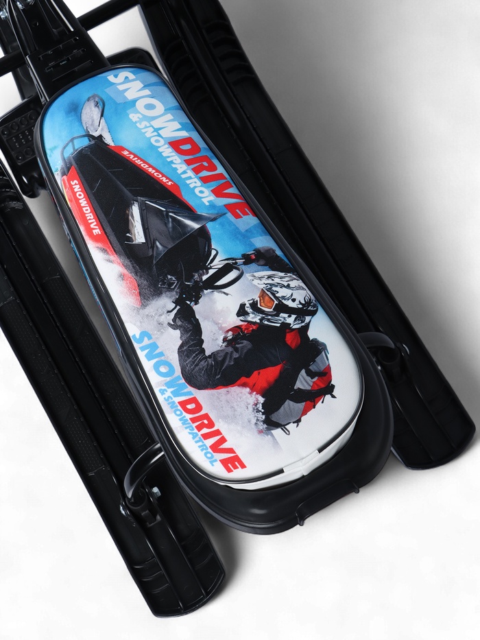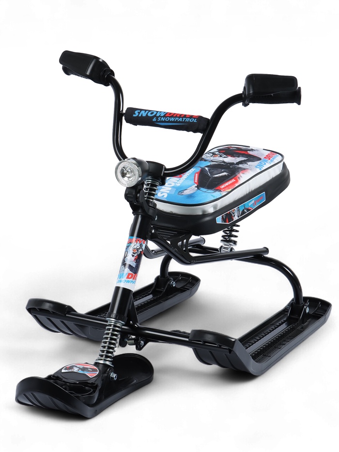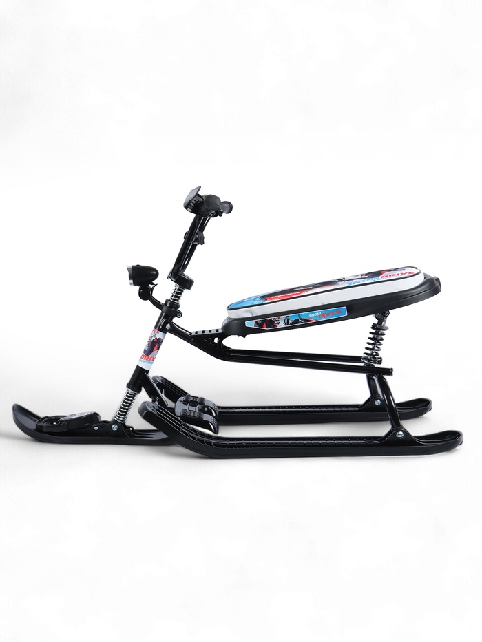 Снегокат предназначен для перевозки детей по плотному снегу, льду, а также для катания с горок. Имеет сварную конструкцию из стальных труб и пластиковых элементов и удлинённое мягкое сиденье. Снегокат оборудован буксировочным тросом с автоматической намоткой. Фонарик на руле осветит дорогу в тёмное время суток. Усиленный широкий тормоз эффективен на обледенелой поверхности и высокой скорости. В комплект входит набор наклеек на снегокат.