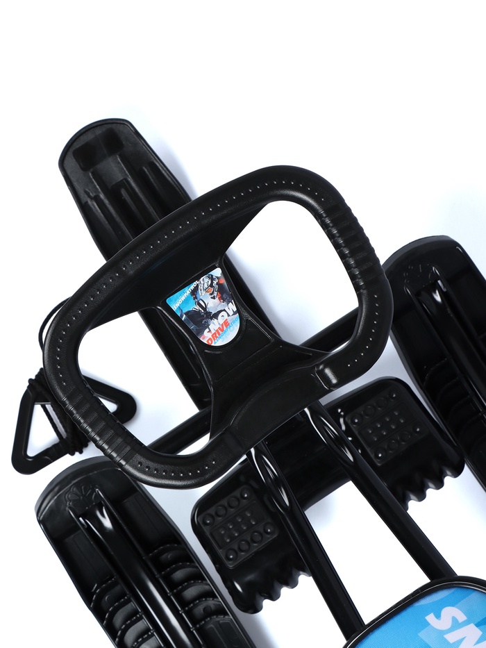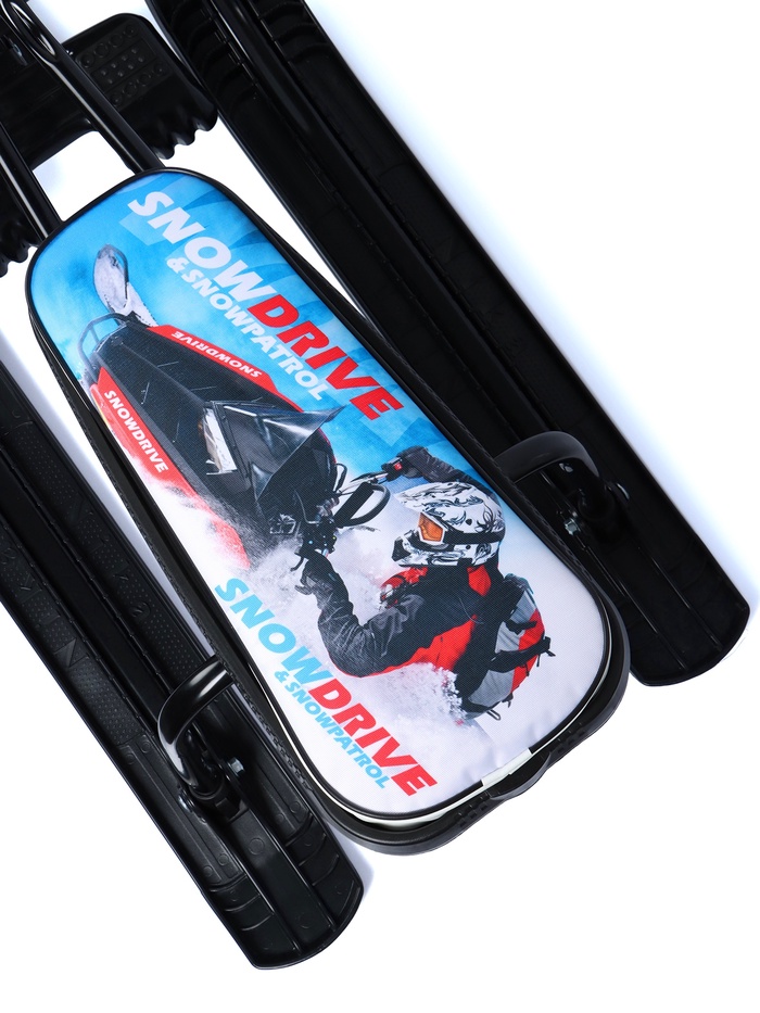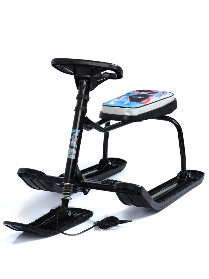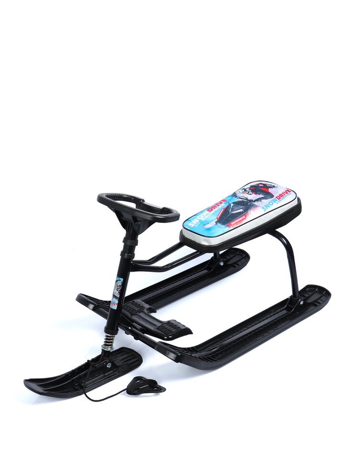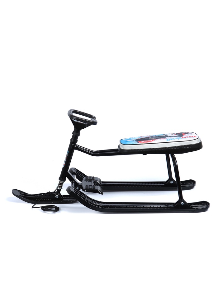 Снегокат предназначен для перевозки детей по плотному снегу или льду, катанию с горок. Имеет сварную конструкцию из стальных труб, пластиковых элементов и мягкое сиденье, обтянутое искусственной кожей с рисунком. Оснащён буксировочным и системой амортизации, которая обеспечивает комфортную поездку по крутым горкам и неровным поверхностям. Усиленный тормоз эффективен на обледенелой поверхности. В комплект входит набор наклеек на снегокат.
