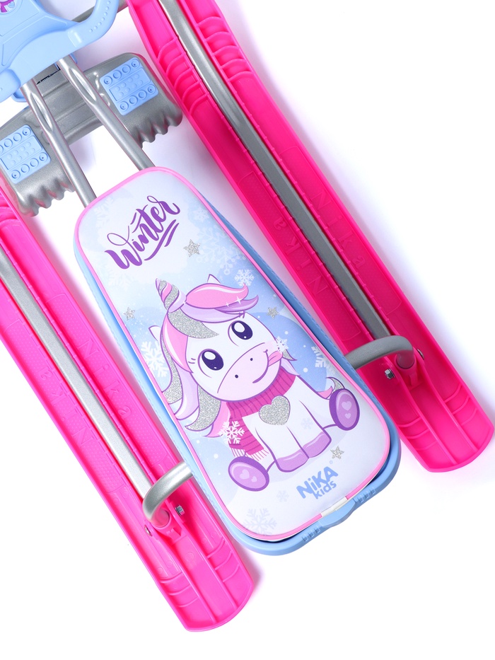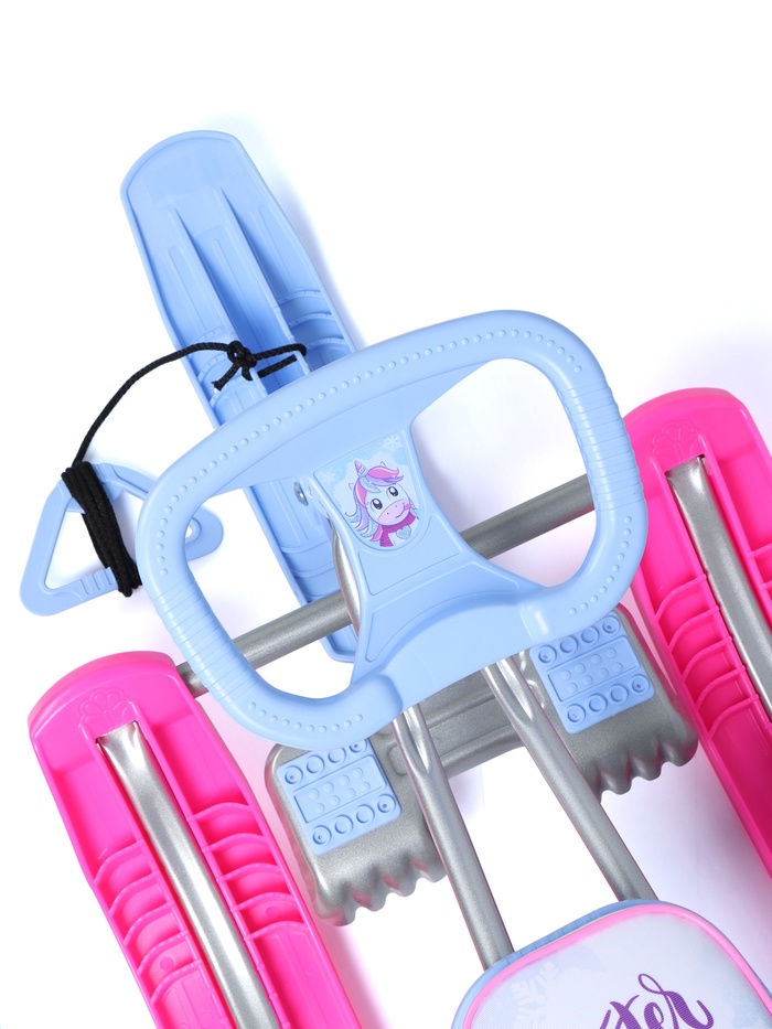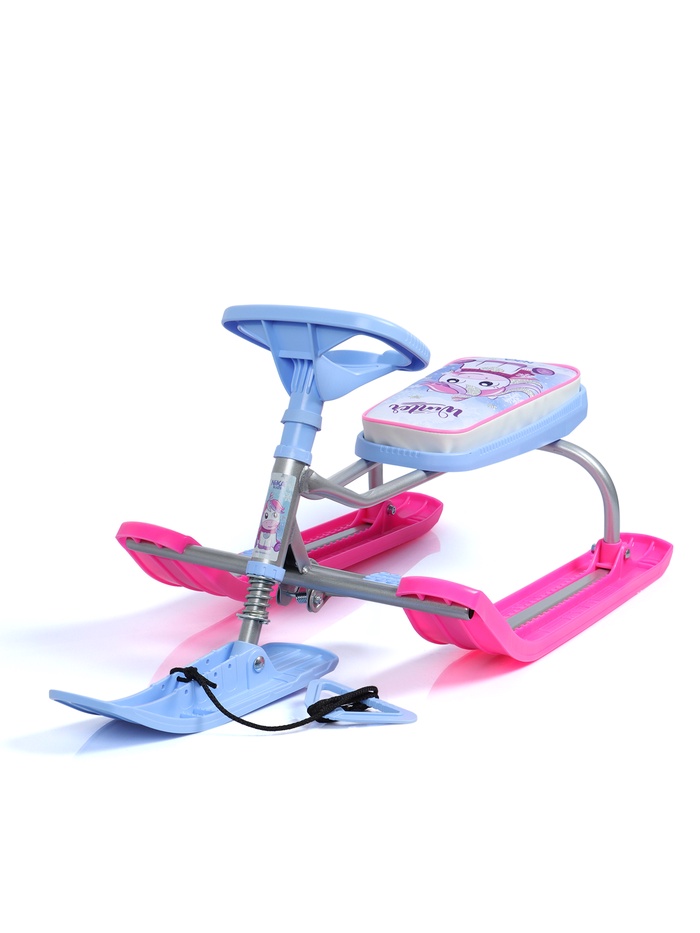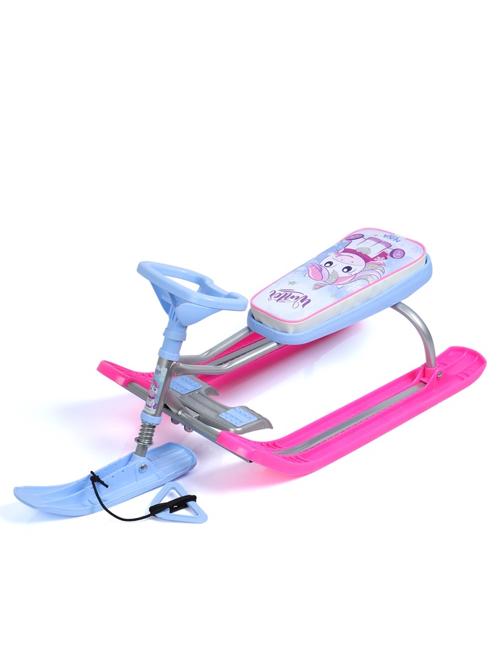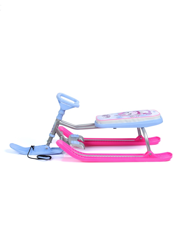 Снегокат предназначен для перевозки детей по плотному снегу или льду, катанию с горок. Имеет сварную конструкцию из стальных труб, пластиковых элементов и мягкое сиденье, обтянутое искусственной кожей с рисунком. Оснащён буксировочным тросом. Усиленный тормоз эффективен на обледенелой поверхности. В комплект входит набор наклеек на снегокат.