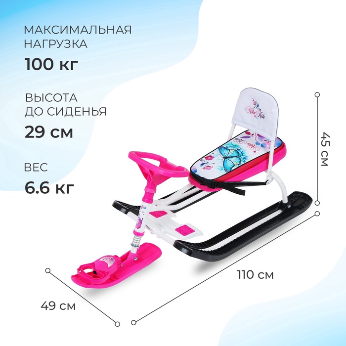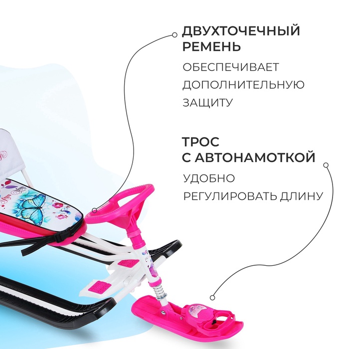 Снегокат предназначен для перевозки детей по плотному снегу или льду, катанию с горок. Имеет сварную конструкцию из стальных труб и пластиковых элементов. Оснащён мягким сиденьем, обтянутым искусственной кожей с рисунком, складной спинкой и двухточечным ремнём безопасности. Оборудован буксировочным тросом с автоматической намоткой и системой амортизации, которая обеспечивает комфортную поездку по крутым горкам и неровным поверхностям. Усиленный тормоз эффективен на обледенелой поверхности.