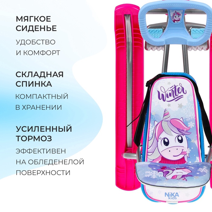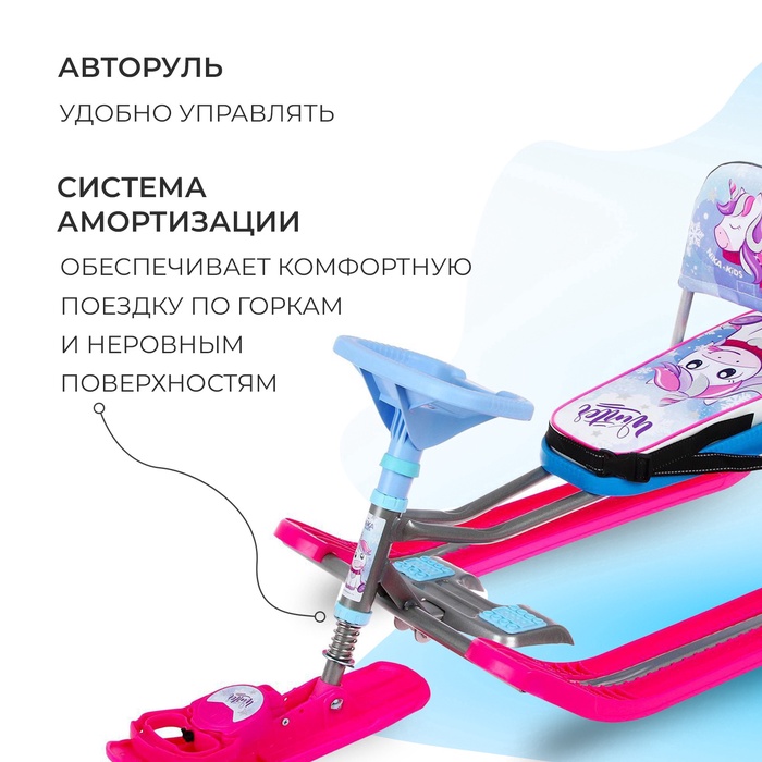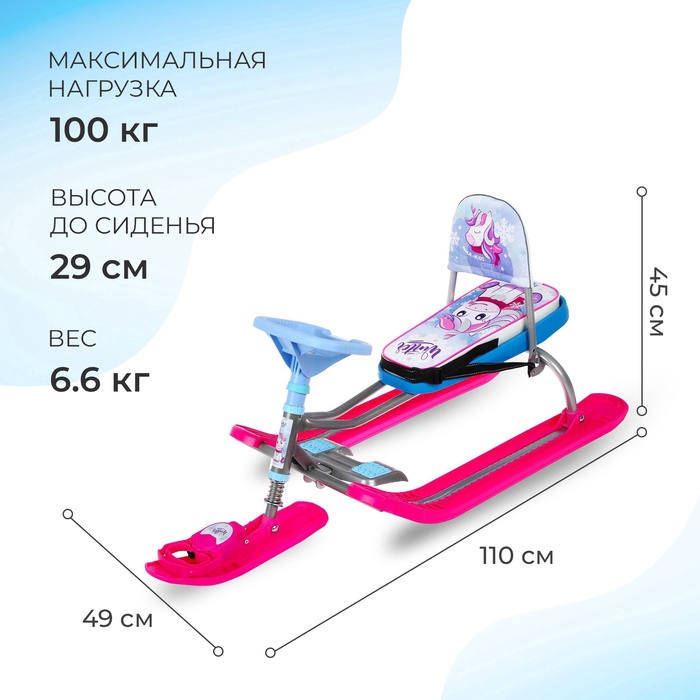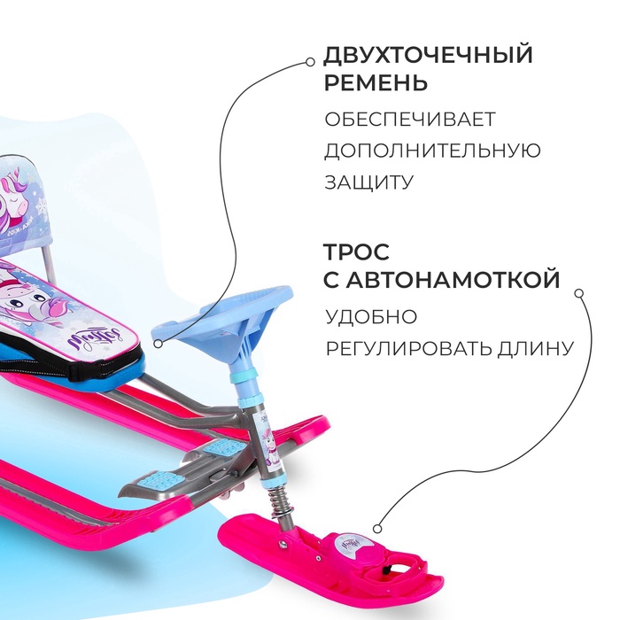 Снегокат предназначен для перевозки детей по плотному снегу или льду, катанию с горок. Имеет сварную конструкцию из стальных труб и пластиковых элементов. Оснащён мягким сиденьем, обтянутым искусственной кожей с рисунком, складной спинкой и двухточечным ремнём безопасности. Оборудован буксировочным тросом с автоматической намоткой и системой амортизации, которая обеспечивает комфортную поездку по крутым горкам и неровным поверхностям. Усиленный тормоз эффективен на обледенелой поверхности.