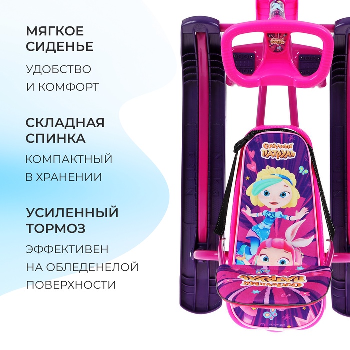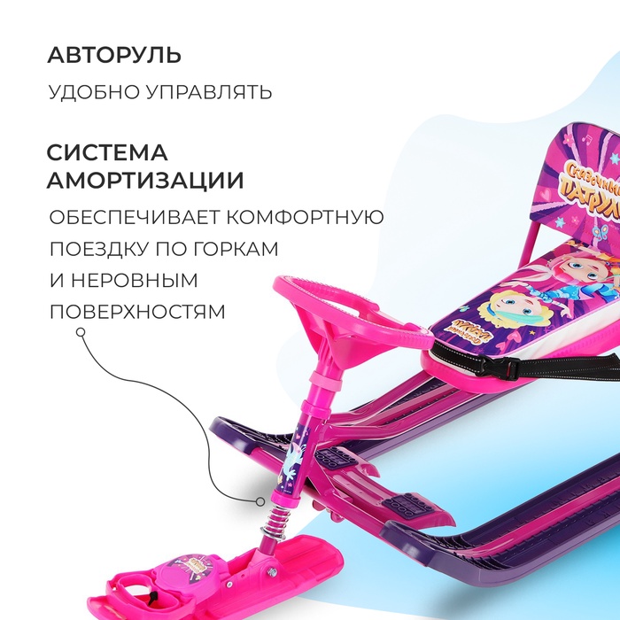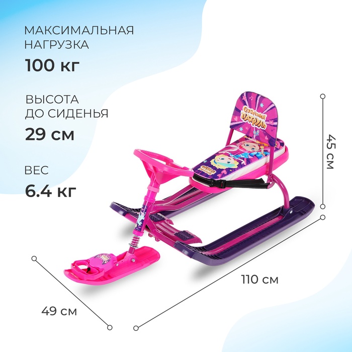 Снегокат предназначен для перевозки детей по плотному снегу или льду, катанию с горок. Имеет сварную конструкцию из стальных труб и пластиковых элементов. Оснащён мягким сиденьем, обтянутым искусственной кожей с рисунком, складной спинкой, двухточечным ремнём безопасности. Оборудован буксировочным тросом с автоматической намоткой и системой амортизации, которая обеспечивает комфортную поездку по крутым горкам и неровным поверхностям. Усиленный тормоз эффективен на обледенелой поверхности.
