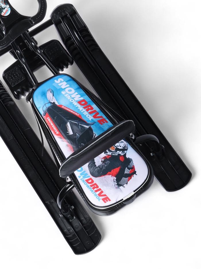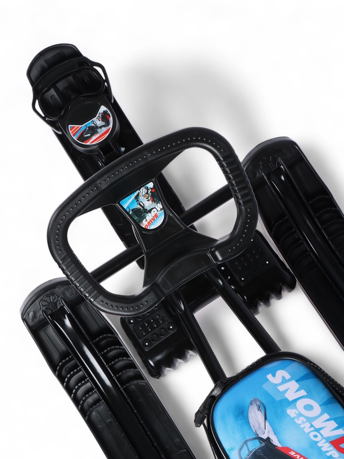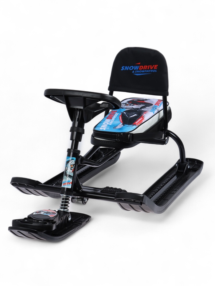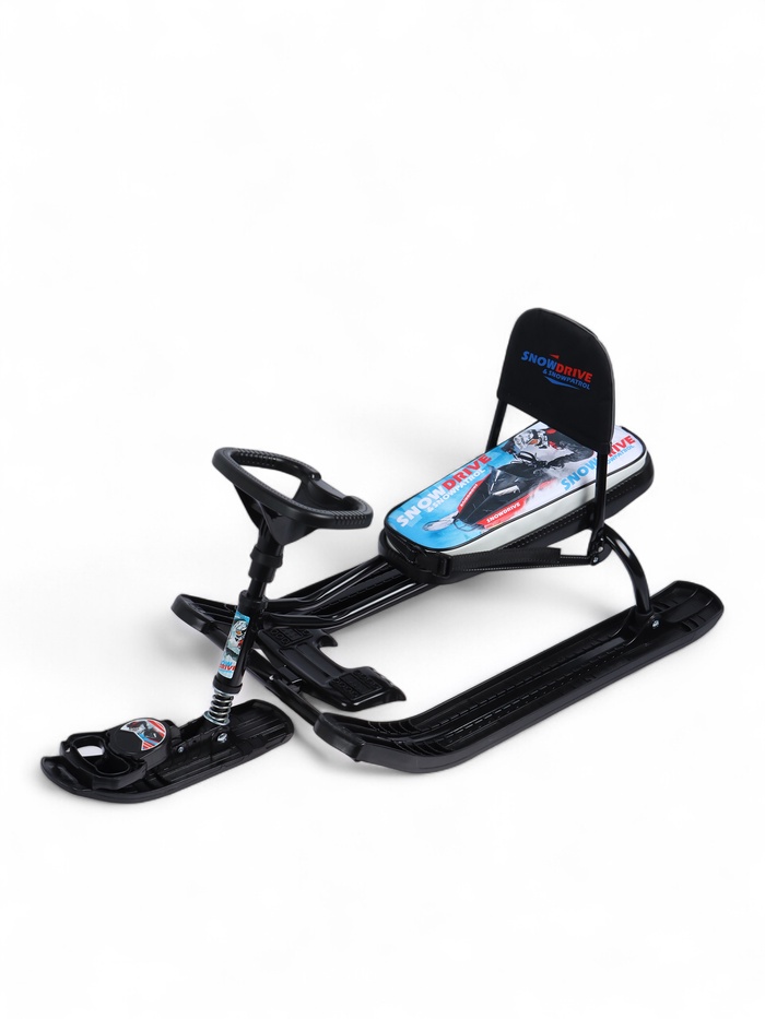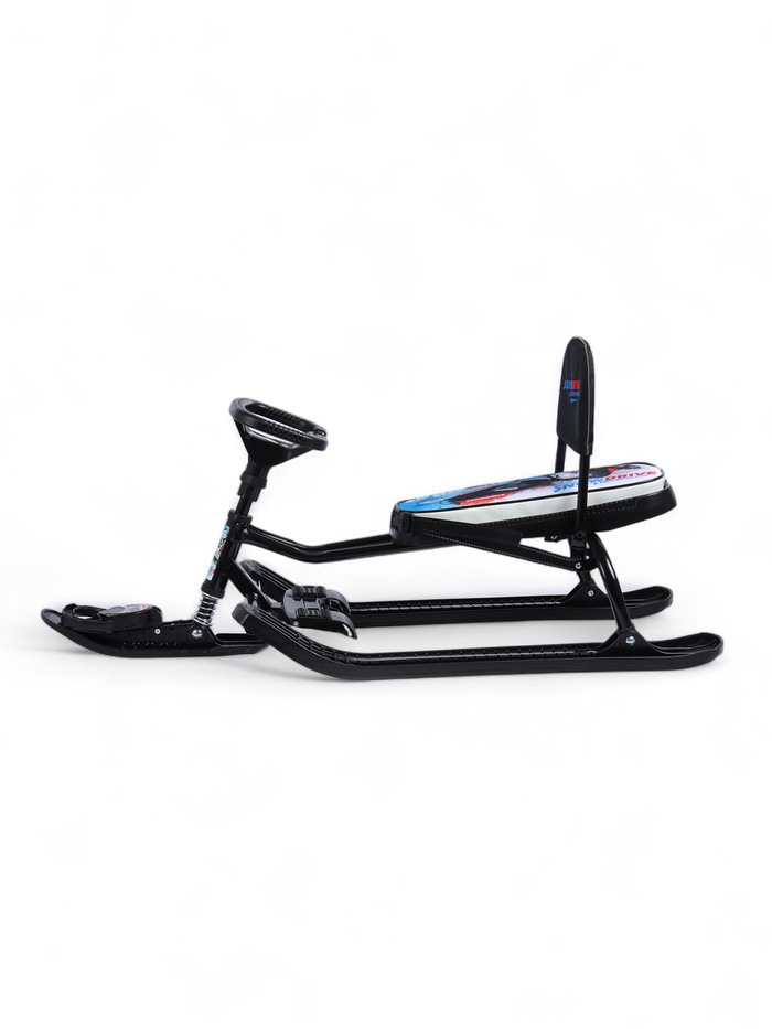 Снегокат предназначен для перевозки детей по плотному снегу или льду, катанию с горок. Имеет сварную конструкцию из стальных труб и пластиковых элементов. Оснащён мягким сиденьем, обтянутым искусственной кожей с рисунком, складной спинкой и двухточечным ремнём безопасности. Оборудован буксировочным тросом с автоматической намоткой и системой амортизации, которая обеспечивает комфортную поездку по крутым горкам и неровным поверхностям. Усиленный тормоз эффективен на обледенелой поверхности.