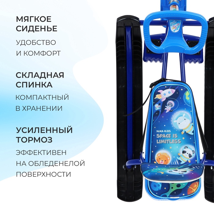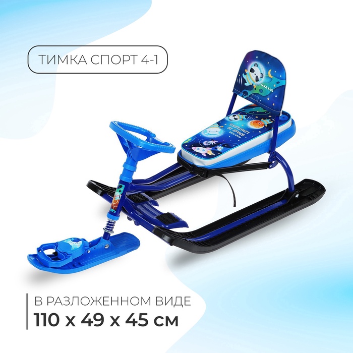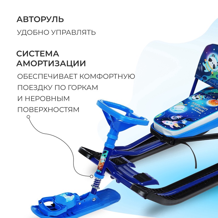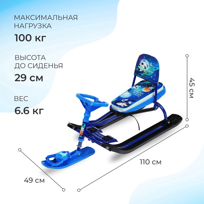 Снегокат предназначен для перевозки детей по плотному снегу или льду. Имеет сварную конструкцию из стальных труб, пластиковых элементов и мягкое сиденье, обтянутое искусственной кожей. Оснащён двухточечным ремнём безопасности, буксировочным тросом с автоматической намоткой и складной спинкой. Усиленный тормоз эффективен на обледенелой поверхности.
