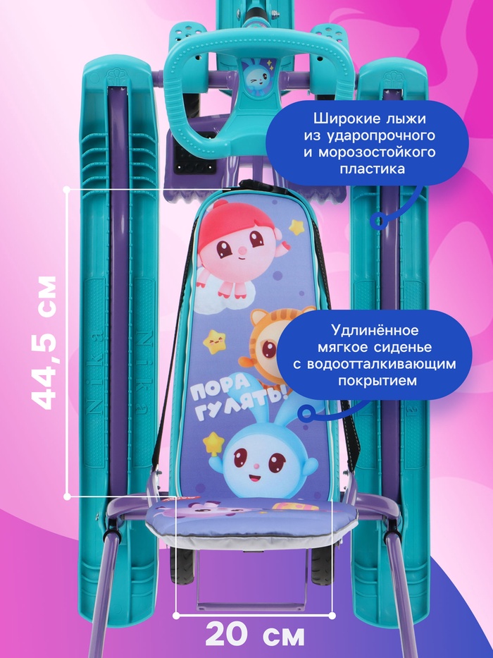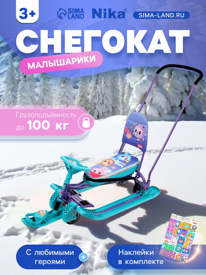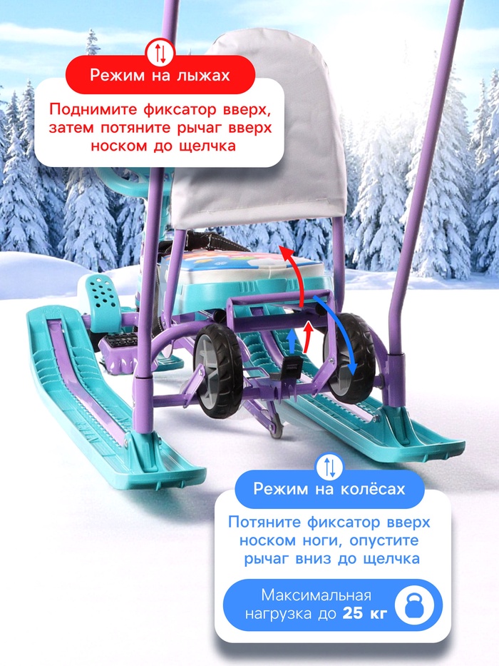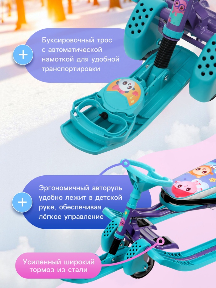 Снегокат предназначен для перевозки детей по плотному снегу, льду или более твёрдой поверхности, а также для катания с горок. Имеет сварную конструкцию из стальных труб и пластиковых элементов и удлинённое мягкое сиденье. Снегокат оборудован буксировочным тросом с автоматической намоткой и двухточечным ремнём безопасности. Выдвижные шасси облегчают передвижение по непокрытой снегом дороге, такой как асфальт или грунт. Родительская ручка позволяет легко управлять транспортом. Усиленный широкий тормоз эффективен на обледенелой поверхности и высокой скорости. В комплект входит набор наклеек на снегокат.