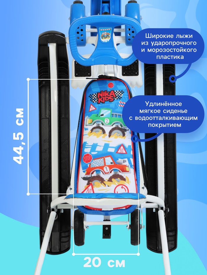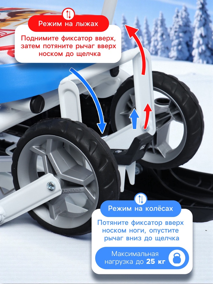 Снегокат предназначен для перевозки детей по плотному снегу, льду или более твёрдой поверхности, а также для катания с горок. Имеет сварную конструкцию из стальных труб и пластиковых элементов и удлинённое мягкое сиденье. Снегокат оборудован буксировочным тросом с автоматической намоткой и двухточечным ремнём безопасности. Выдвижные шасси облегчают передвижение по непокрытой снегом дороге, такой как асфальт или грунт. Родительская ручка позволяет легко управлять транспортом. Усиленный широкий тормоз эффективен на обледенелой поверхности и высокой скорости. В комплект входит набор наклеек на снегокат.