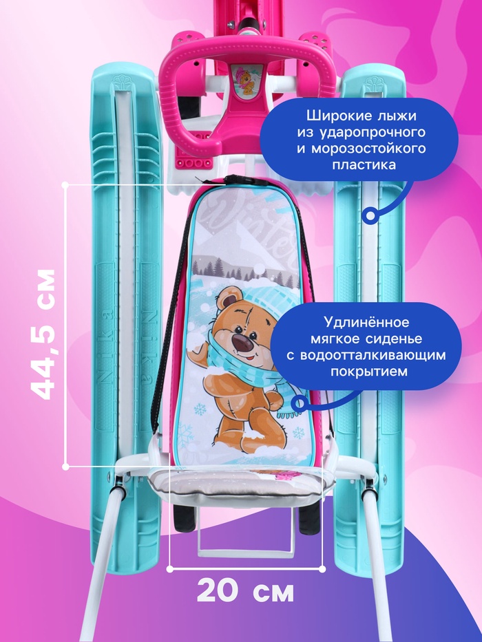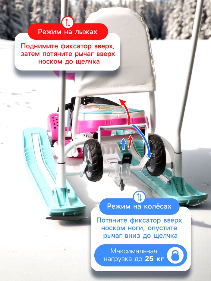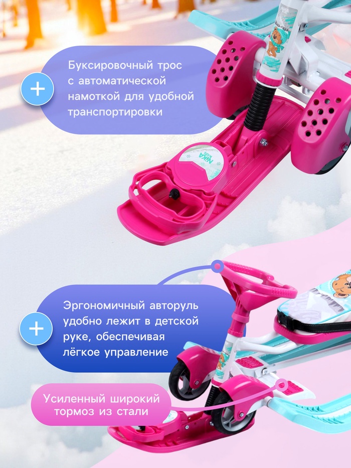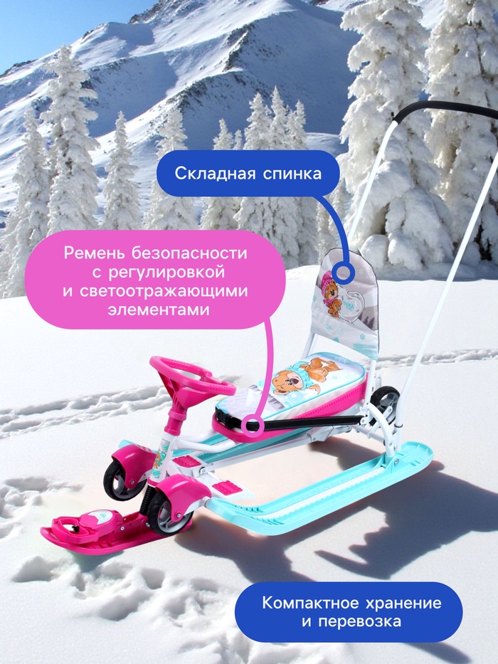 Снегокат предназначен для перевозки детей по плотному снегу, льду или более твёрдой поверхности, а также для катания с горок. Имеет сварную конструкцию из стальных труб и пластиковых элементов и удлинённое мягкое сиденье. Снегокат оборудован буксировочным тросом с автоматической намоткой и двухточечным ремнём безопасности. Выдвижные шасси облегчают передвижение по непокрытой снегом дороге, такой как асфальт или грунт. Родительская ручка позволяет легко управлять транспортом. Усиленный широкий тормоз эффективен на обледенелой поверхности и высокой скорости. В комплект входит набор наклеек на снегокат.