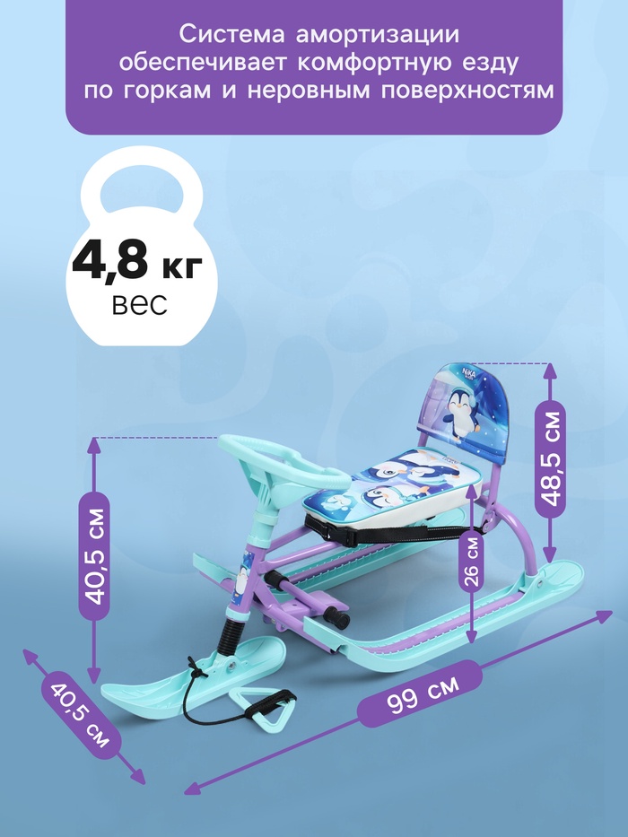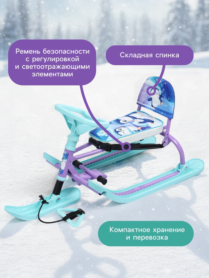 Снегокат предназначен для перевозки детей по плотному снегу или льду, катанию с горок. Имеет сварную конструкцию из стальных труб, пластиковых элементов и мягкое сиденье. Оборудован буксировочным тросом. Тормоз эффективен на обледенелой поверхности.
