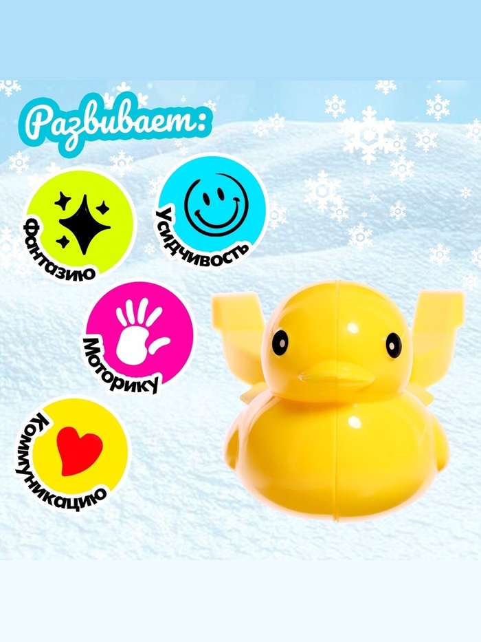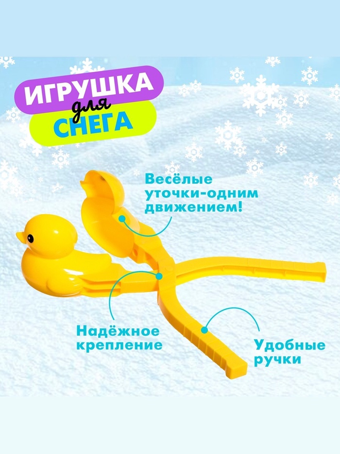 Пластиковый снежколеп пригодится малышам для весёлых зимних игр! С помощью этой игрушки ребёнок легко и быстро сделает много ровных и красивых снежков в форме уточек, а его варежки не промокнут!