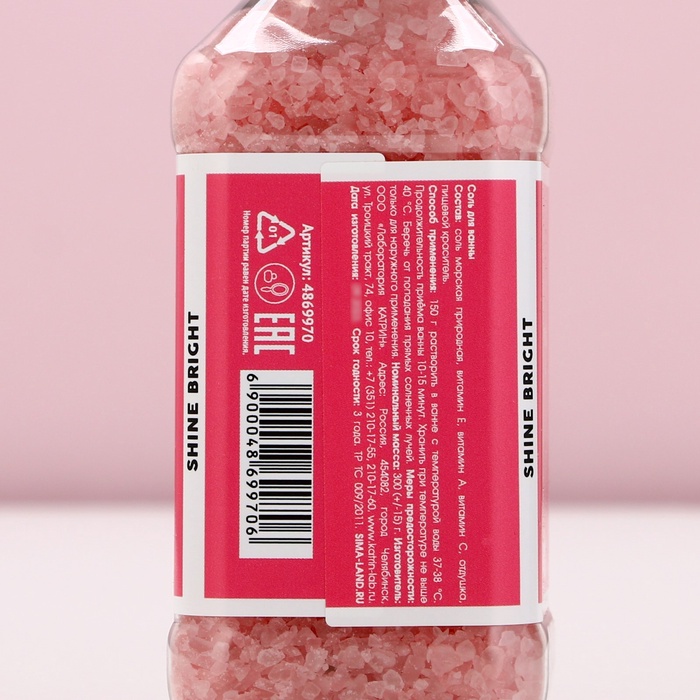Состав: соль морская природная, витамин Е, витамин А, витамин С, отдушка, пищевой краситель.
