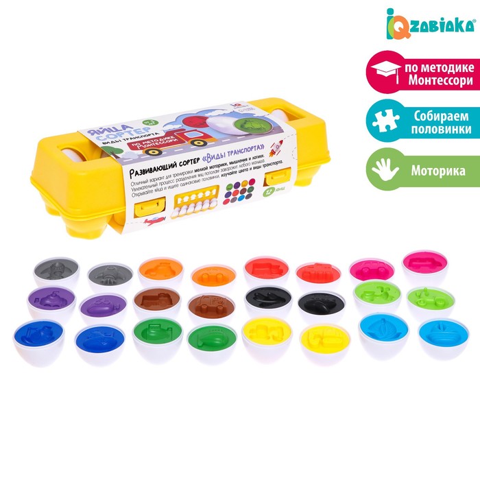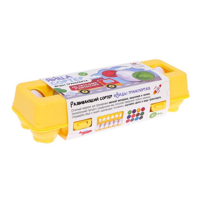 Внутри вы найдёте 12 яиц. Задача малыша — правильно подобрать и совместить половинки яиц с изображениями транспорта.