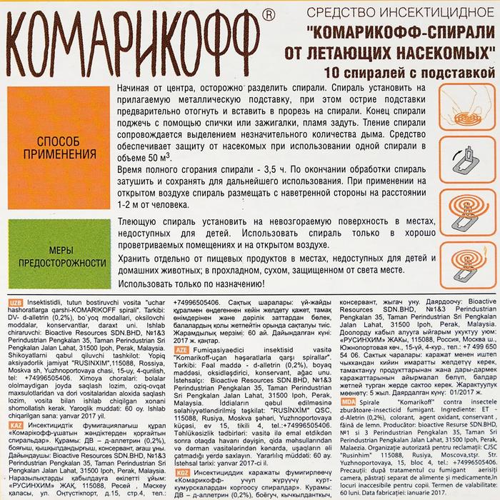 Летний сезон – это время отдыха на природе, пикников и прогулок на свежем воздухе. Однако, вместе с этим приходит и необходимость бороться с насекомыми, которые могут испортить любой отдых. Комары и мошки – самые распространенные представители назойливых насекомых. Для их борьбы было создано множество средств, но одним из самых эффективных являются спирали от комаров и мошек "Комарикофф".Спирали "Комарикофф" – это средство, которое позволяет защититься от насекомых на длительный период времени. Они изготавливаются из натуральных компонентов, таких как древесный уголь, порошок пиретриновых цветов и другие растительные экстракты. Благодаря этому, спирали "Комарикофф" не только эффективно борются с комарами и мошками, но и безопасны для здоровья человека.Одной из главных преимуществ спиралей "Комарикофф" является их длительное действие. Они способны защитить от насекомых на протяжении 3,5 часов, что позволяет проводить время на природе без необходимости постоянно наносить новые средства от комаров и мошек. Кроме того, спирали "Комарикофф" имеют приятный аромат, который не вызывает дискомфорта у людей.Достаньте средство из упаковки и осторожно разъедините, отогните стойку на металлической подставке, которая идет в подарок, а затем закрепите. Для этого на спирали есть специальная прорезь, после поджигайте конец и задуйте огонь, поместите на открытом воздухе с подветренной стороны. Действие средства начнется через 10 минут. В закрытых помещениях использовать в отсутствии людей. Полная гибель происходит через 10-20 минут. После помещение проветрить. Заказывайте средства от кровососущих «Оффлайн комарофф» и получите подставку-держатель.Они изготавливаются из натуральных компонентов, таких как древесный уголь, порошок пиретриновых цветов и другие растительные экстракты.