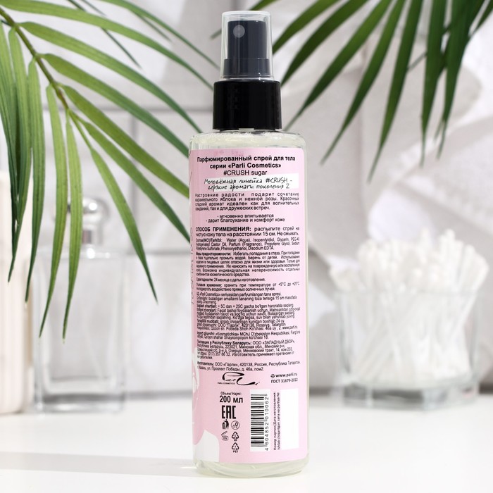 Увлажняющий парфюмированный спрей для тела со звучнием сладости. Чарующая композиция с первых секунд завораживает легкими нотками свежести.