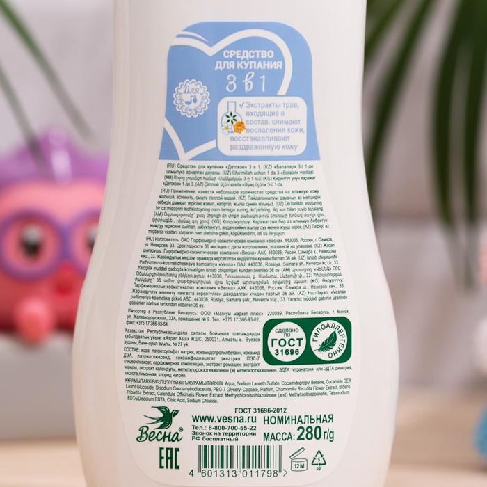 Нежная формула средства для купания 3 в 1 позволяет использовать его универсально при купания малышей - как шампунь, пену для ванной и гель для душа. Продукт гипоаллергенен, прошёл испытания и рекомендована с первых дней жизни.